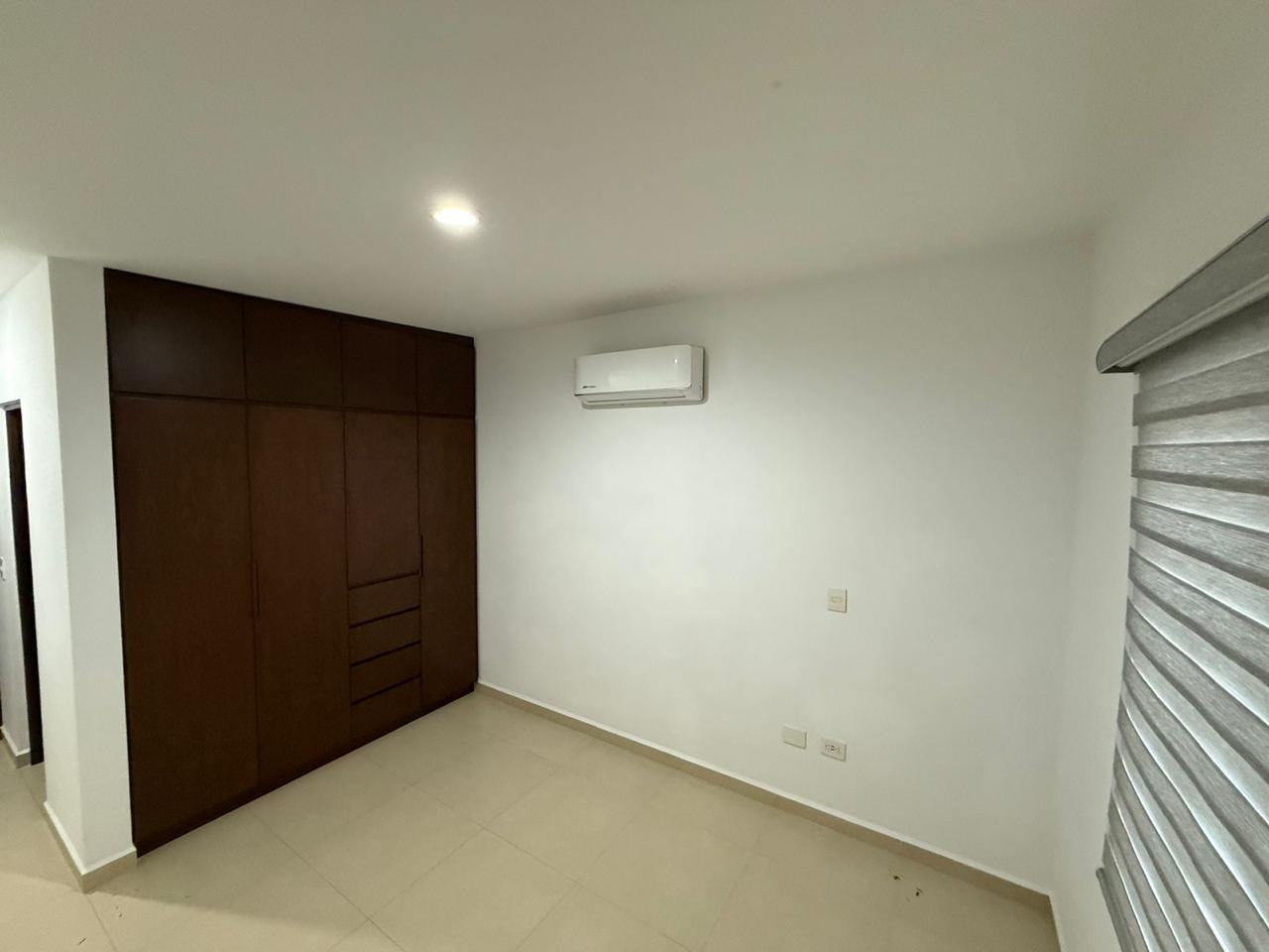 Recámara principal con minisplit, baño completo y vestidor con clóset.