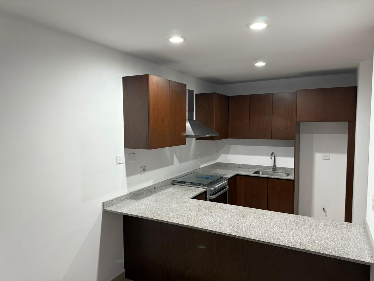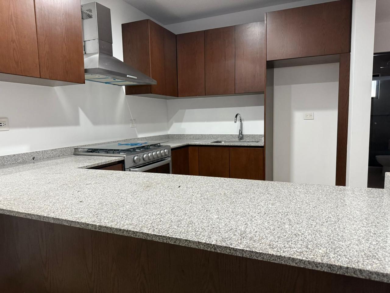 Cocina integral con barra desayunadora, hecha con acabados de encino y granito.