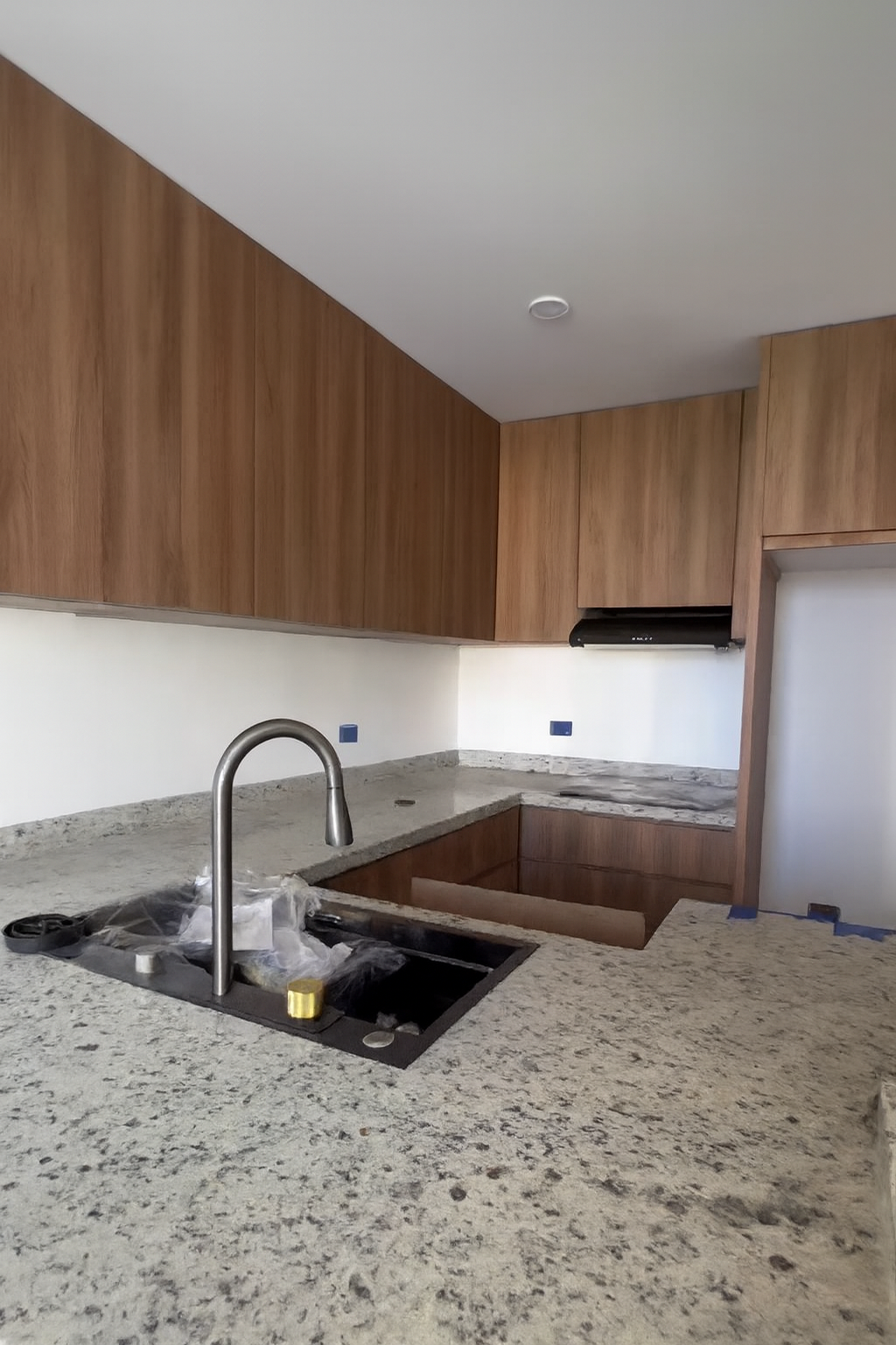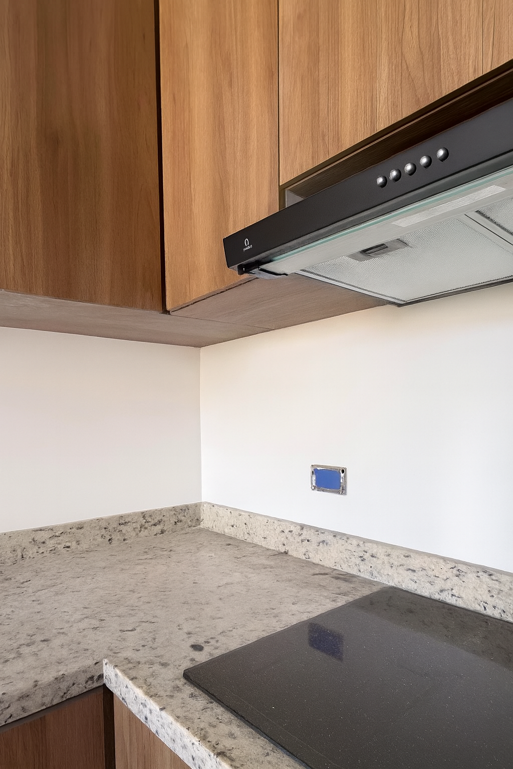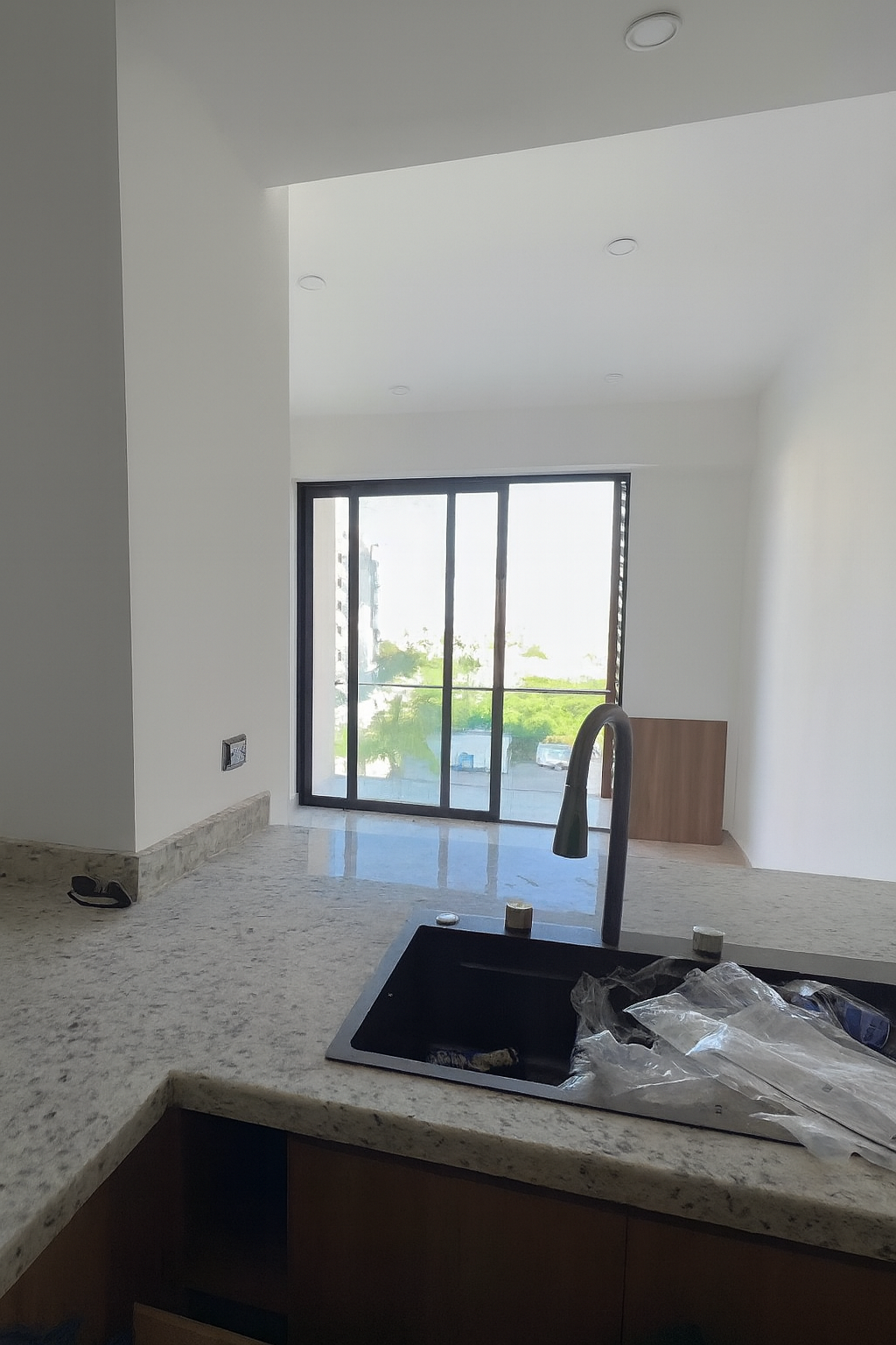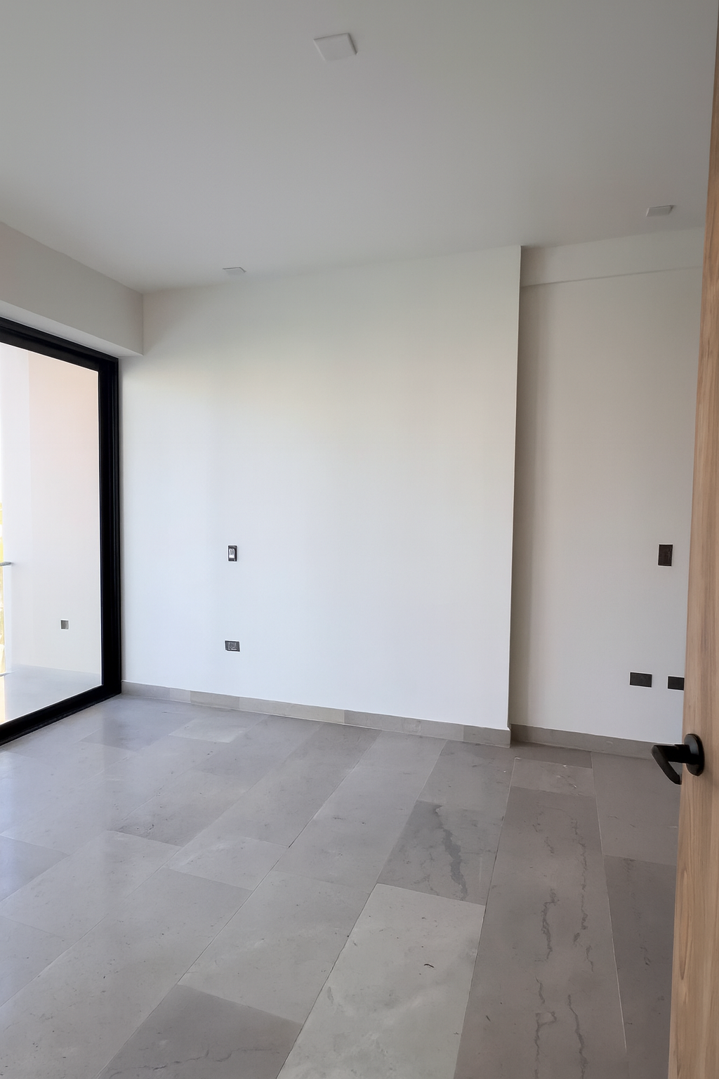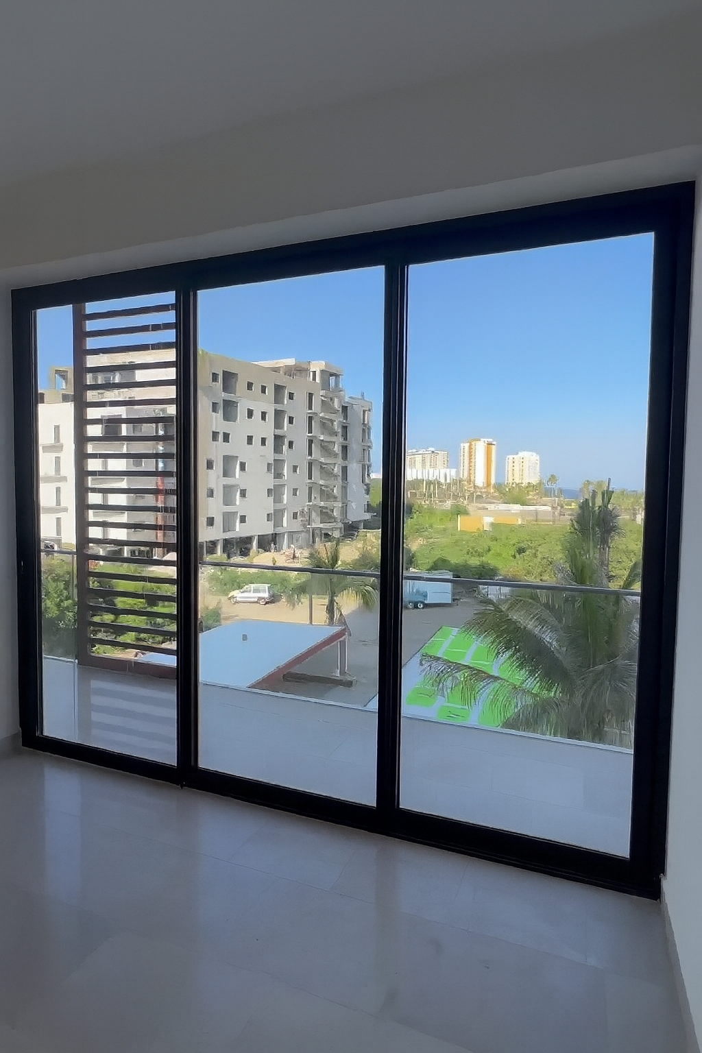 Acceso principal interior del lado derecho se encuentra la cocina con dos barras: la primera donde se alojan los elementos básicos de una cocina (fregadero, estufa y refrigerador) y la segunda barra tipo isla con bancos. Del lado izquierdo al ingresar encontramos la sala con vista hacia la Av. del Estero por medio de un cancel corredizo de gran tamaño ofreciendo iluminación y ventilación natural dando acceso a la terraza. Después se encuentra la recámara con un espacio para closet y un ventanal corredizo que conduce a la terraza. Del lado izquierdo al ingresar a la recámara se encuentra el baño, de frente encontramos las ventanas junto al W.C. y termina con el área de regadera.